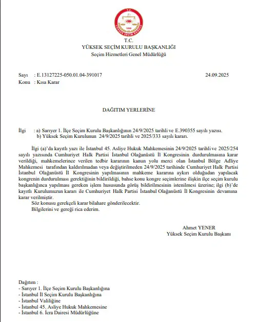 Yüksek Seçim Kurulu, CHP İstanbul İl Kongresi’nin devamına dair kararını “gereği” için İstanbul 45. Asliye Hukuk Mahkemesi’ne gönderdi.