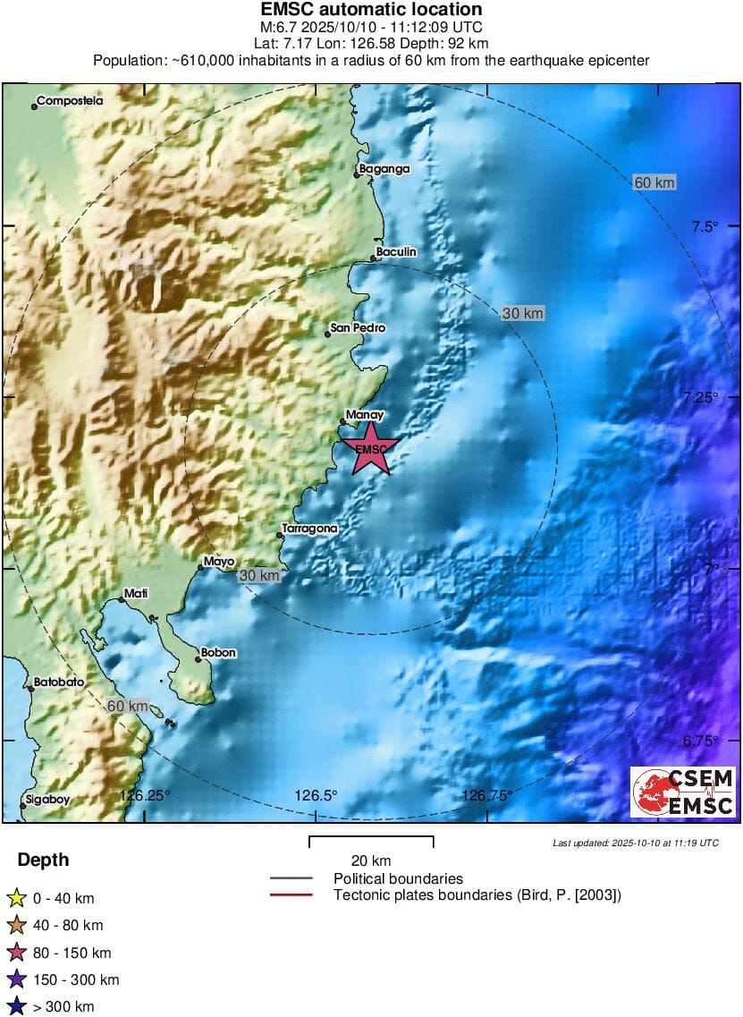 Avrupa-Akdeniz Sismoloji Merkezi tarafından büyüklüğü önce 6,8 olarak açıklanan, daha sonra 6,9 olarak güncellenen deprem yine Mindanao adasında meydana geldi.